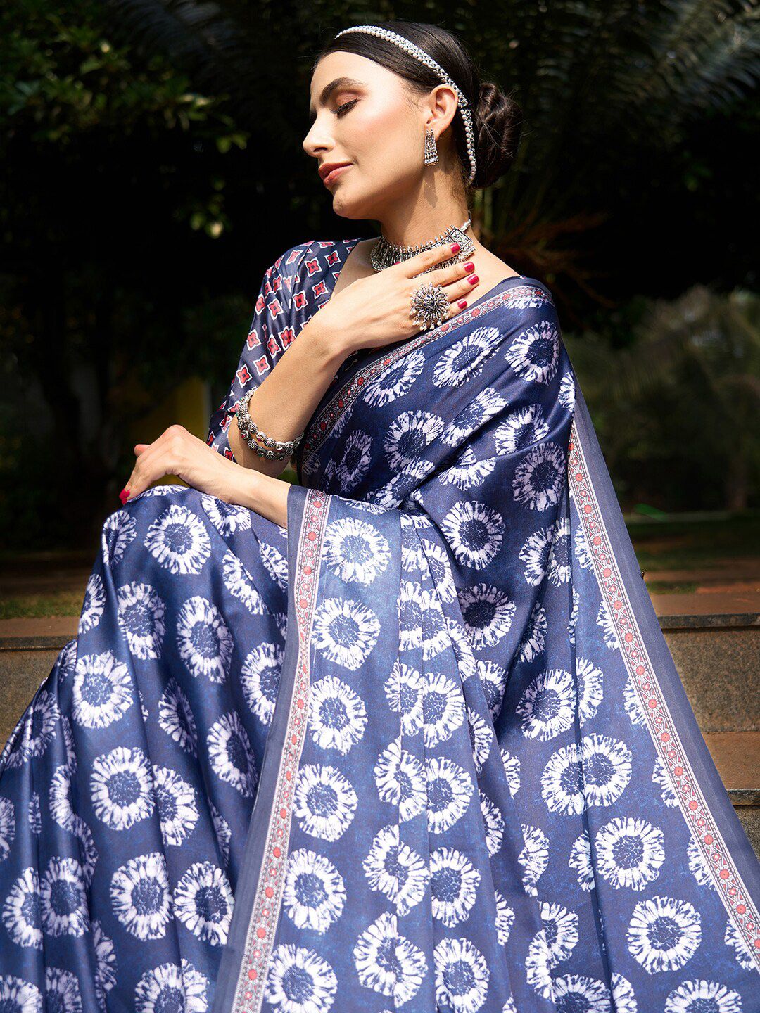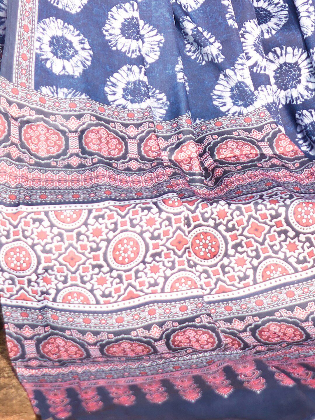 | Design Details | Navy blue block print saree, Tie and dye dyed saree with printed border |
