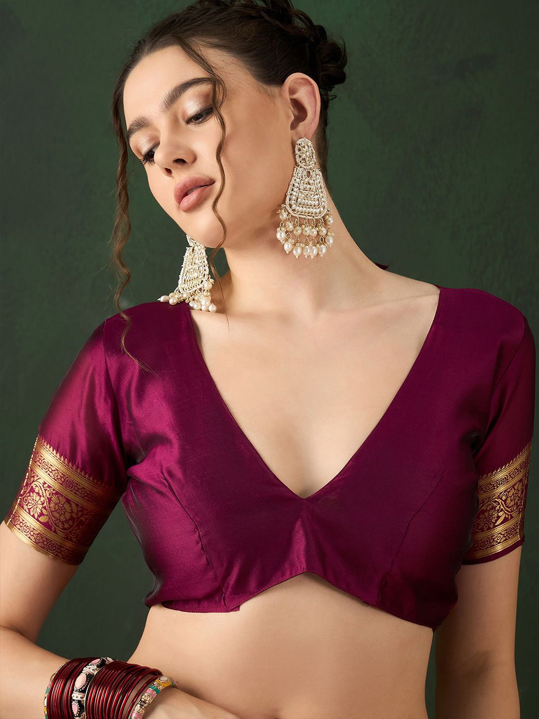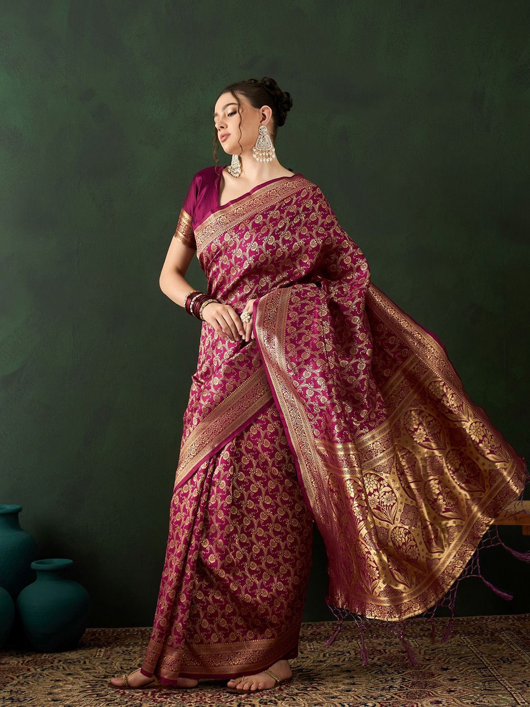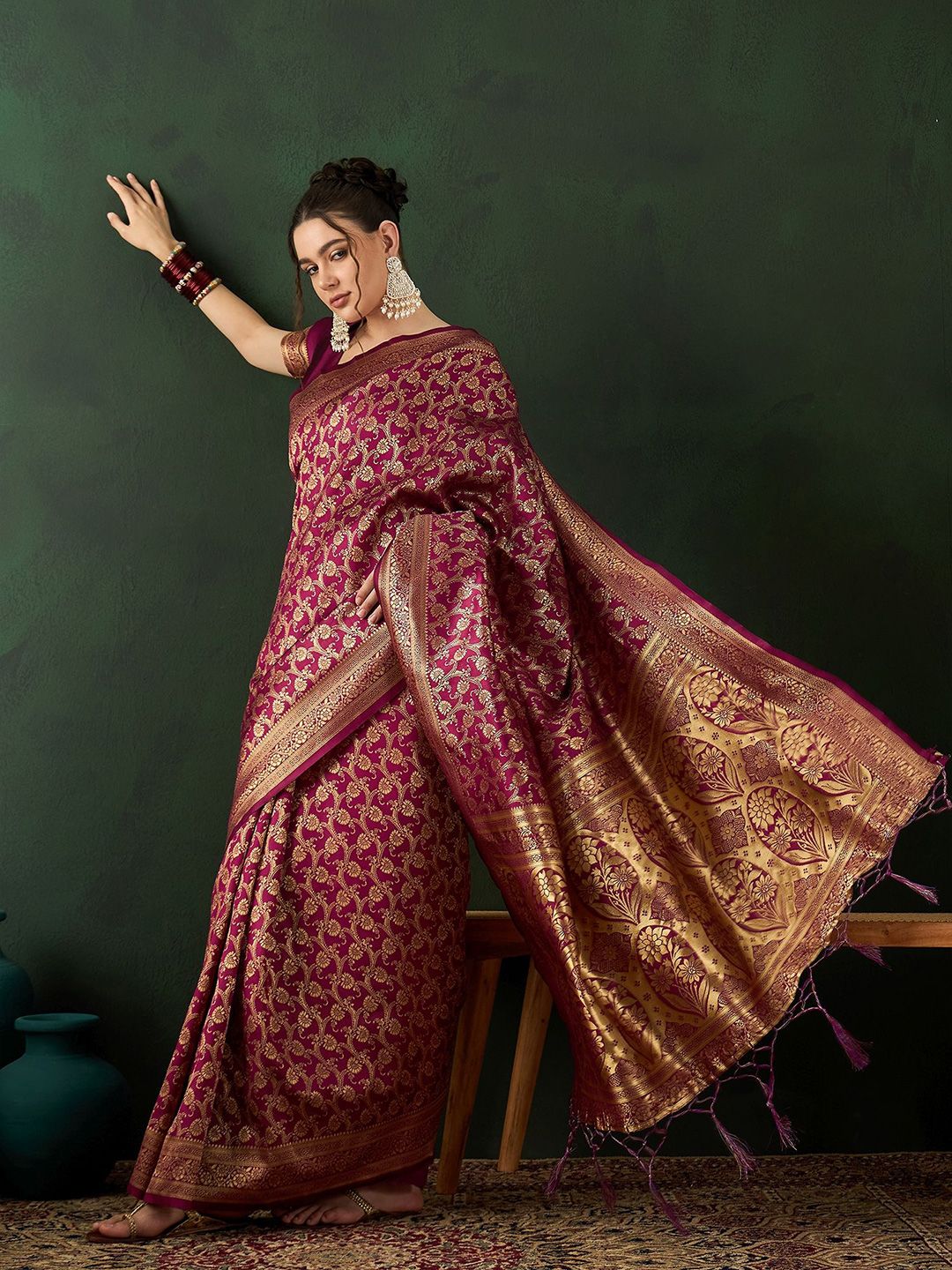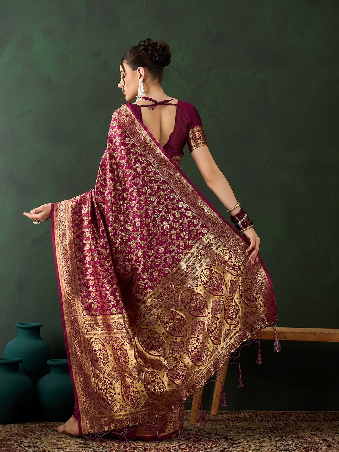 | Design Details | Burgundy saree, Woven design saree with border, Woven design detail |