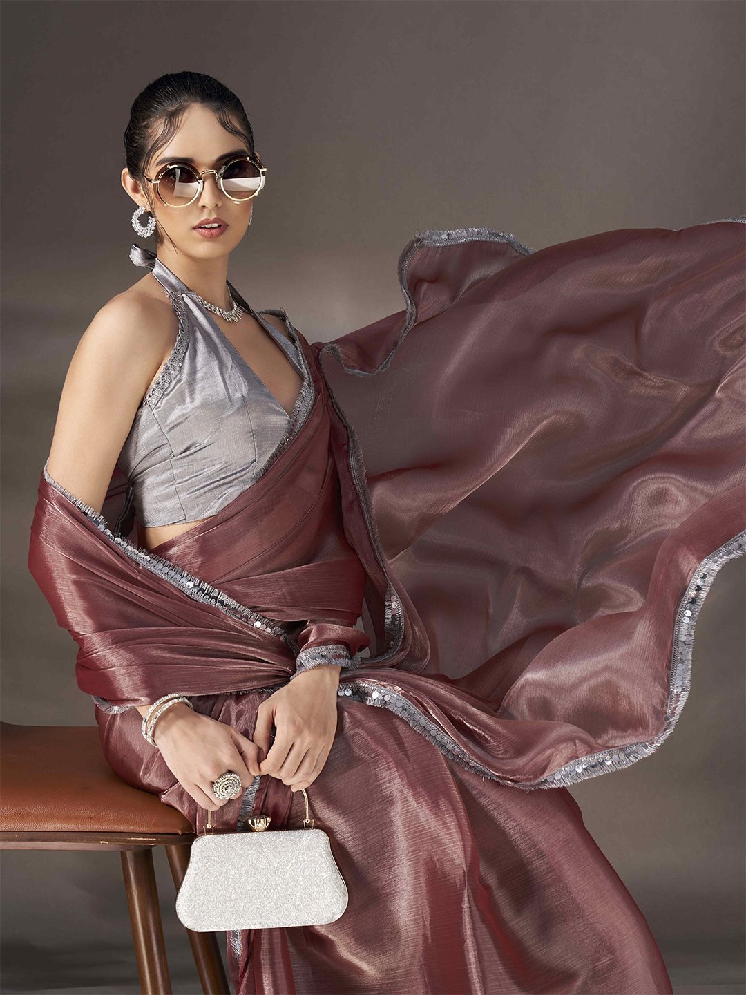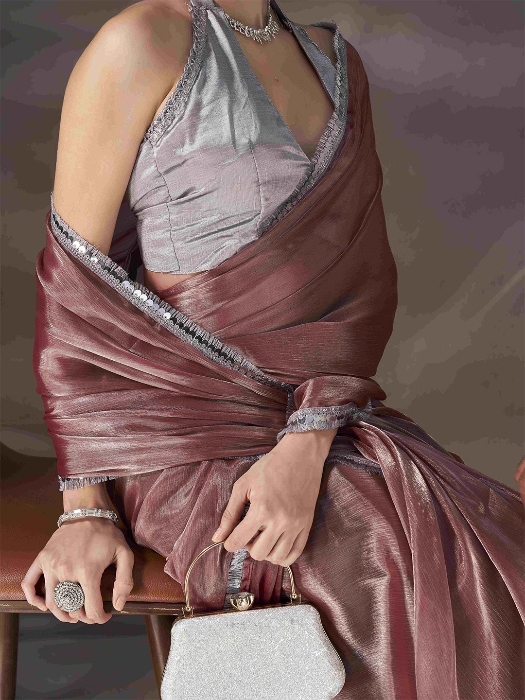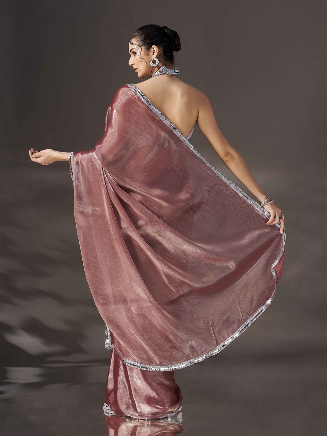 | Design Details | Gunmetal-toned saree, Solid saree with embellished border, Mukaish detail |
